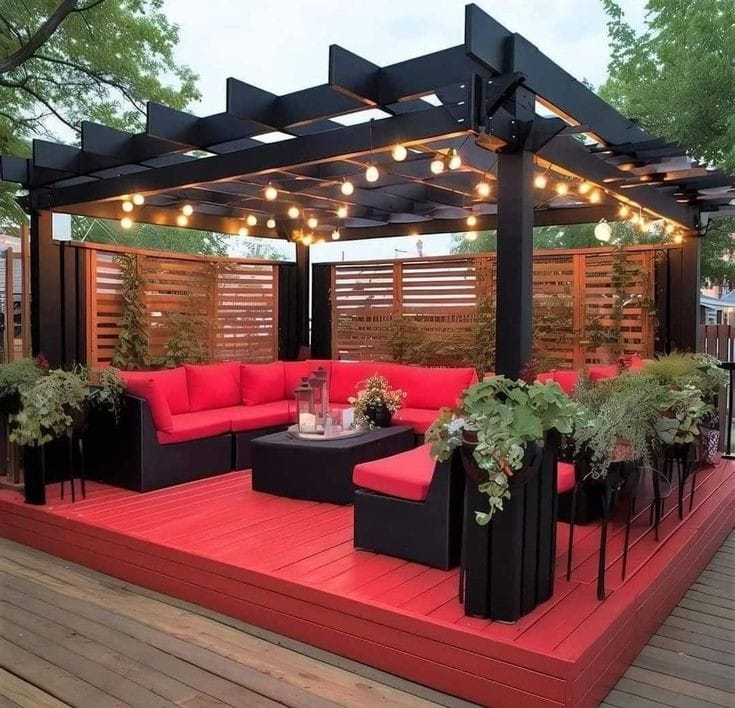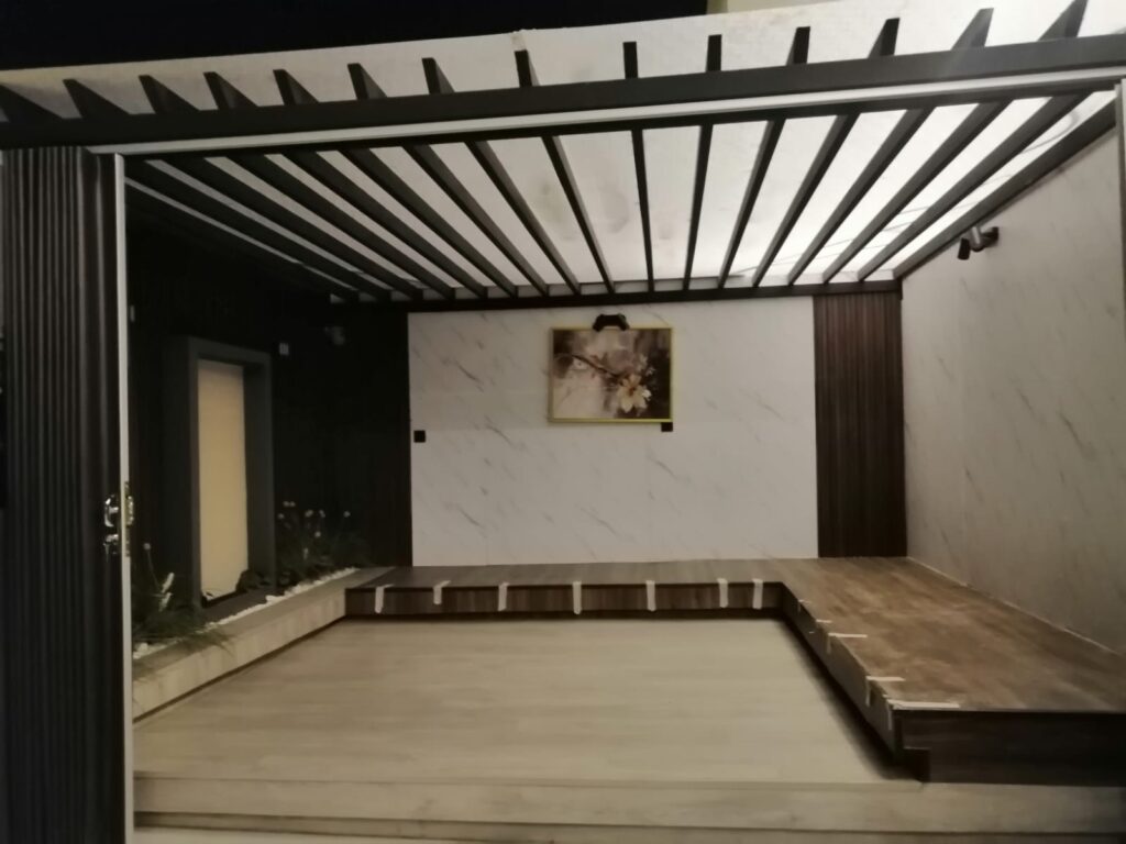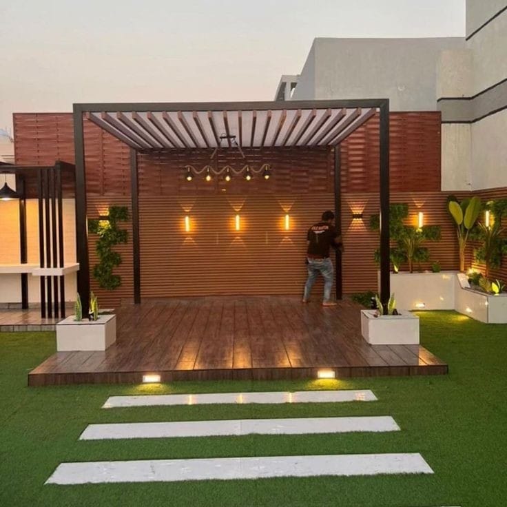 - برجولة (3×4 أو 4×4 أمتار) مع سقف كثيف وإضاءة خفيفة.