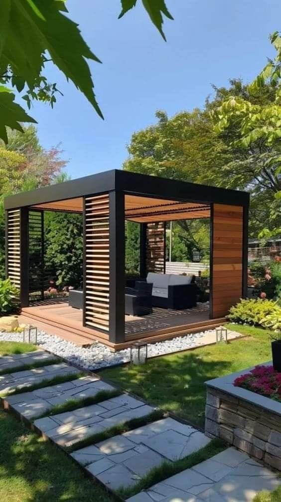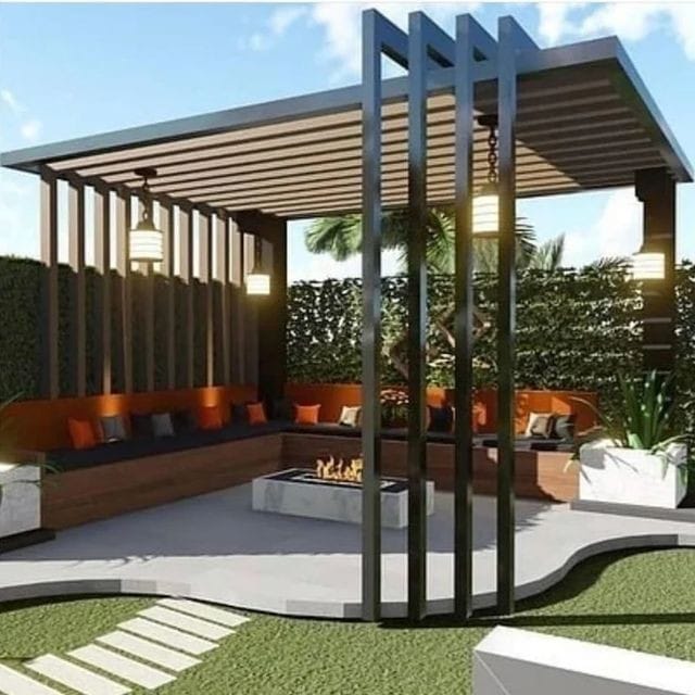 - مساحة صغيرة: برجولة بسيطة بمقعد أو طاولة صغيرة، بدون سقف ضخم.
