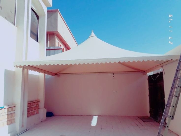 - مظلات قماش الـ PVC: تعتبر من أكثر الأنواع شيوعاً نظراً لمتانتها العالية، مقاومتها للماء والحرارة، وسهولة تنظيفها. تأتي بسماكات وأوزان مختلفة، وتناسب مواقف السيارات والمساحات الكبيرة.