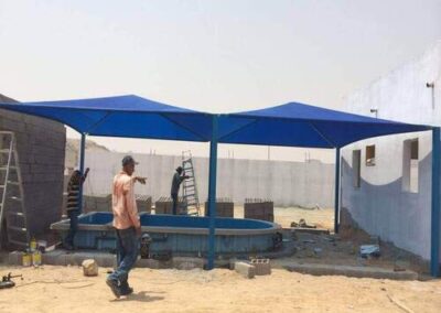 - يتم اختيار شكل المظلات وتصميمها حسب المكان وتصميم المسبح ثم يبدأ العمال في تحديد تصميم مناسب للمسبح ولذوق العميل.